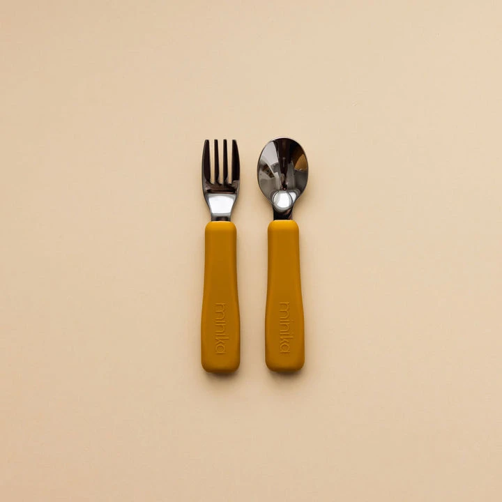 Ensemble de fourchette et cuillère avec poignée en silicone. Silicone alimentaire sans BPA, PVC, phtalates et sans plomb. Laver avec du savon et un chiffon mouillé ou au lave-vaisselle. Acier inoxydable. Poignée en silicone anti-dérapante.