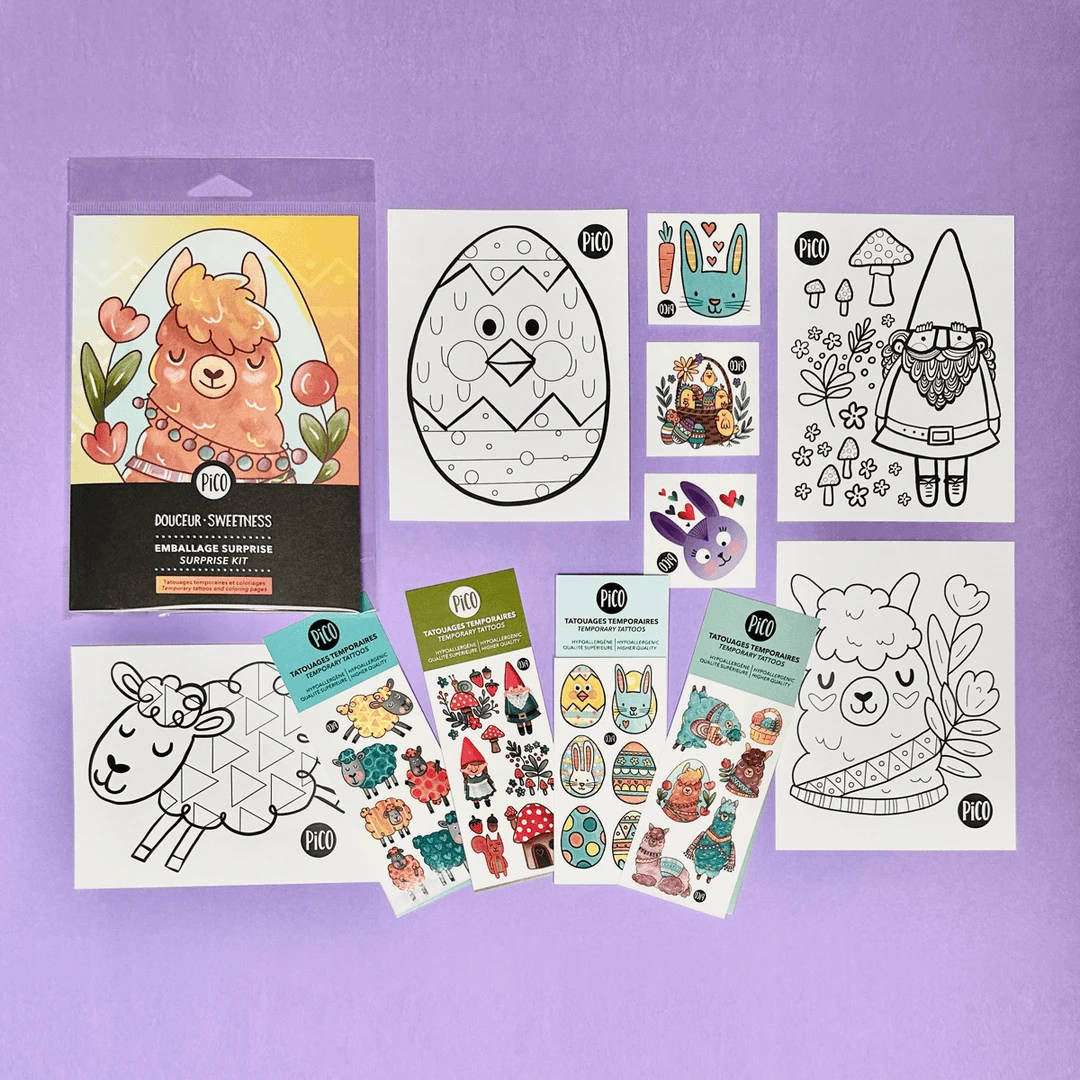 L’ensemble surprise «Douceur» est l’ensemble parfait pour vous crĂ©er de beaux moments en famille Ă l’occasion de PĂąques. L’ensemble est Ă©galement parfait pour cachez des tatouages dans vos oeufs de PĂąques pour la traditionnelle chasse aux cocos. C’est le cadeau parfait pour complĂ©ter ou remplacer le chocolat et les friandises. Vous pouvez Ă©galement vous procurer l’ensemble surprise de PĂąques pour complĂ©ter vos activitĂ©s.
