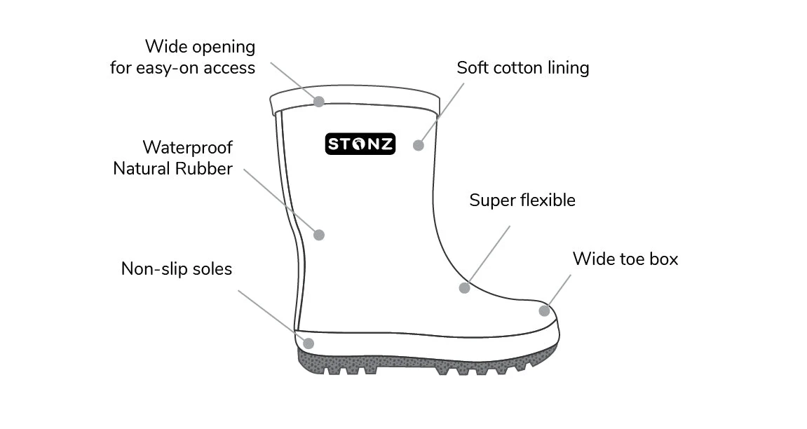 Facile à mettre, enlever et propre: avec une ouverture extra large, elles sont faciles à enfiler pour les petits doigts, tandis que la surface tout en caoutchouc se nettoie en un clin d’œil même après des jours boueux.